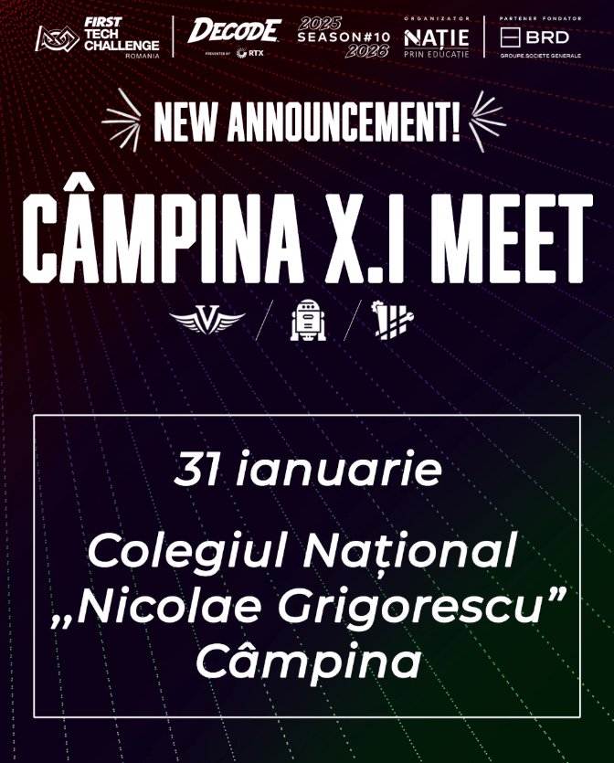 On Saturday, January 31st, 2026, the city of Câmpina will become a hub of innovation and competitive spirit as it hosts the Câmpina X.I Meet, an official FIRST Tech Challenge League Meet for Romania’s South-East Region. The event is proudly organized by the robotics teams Undefined, Ro2D2, and Velocity, whose combined efforts aim to deliver a professional and inspiring competition experience.