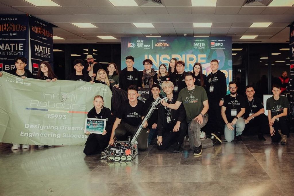 Our journey began in 2018, and we are currently participating in our 6th season of FTC. Coming from the National College „I.L. Caragiale” in Ploiești, our team is composed of 15 members, 4 special volunteers, 3 mentors, and 5 peer-mentors with a passion for robotics and technology. Despite the evolving composition of our team each year, our commitment to mission, vision, and core values remains the same. We view mistakes as opportunities for growth, learning from each experience to strengthen our team, balancing hard work with enjoyment, we train effectively while fostering a collaborative and enjoyable atmosphere.